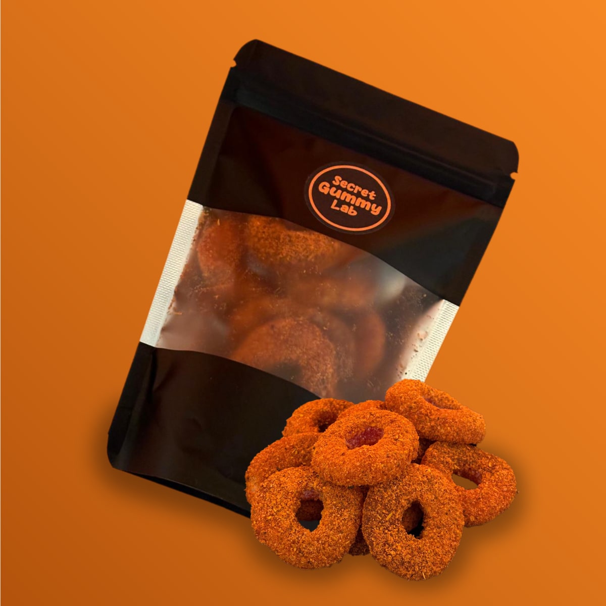 Suaves gomitas de aros de durazno enchilados con nuestro chamoy secreto y cubiertos mix de chilitos.
