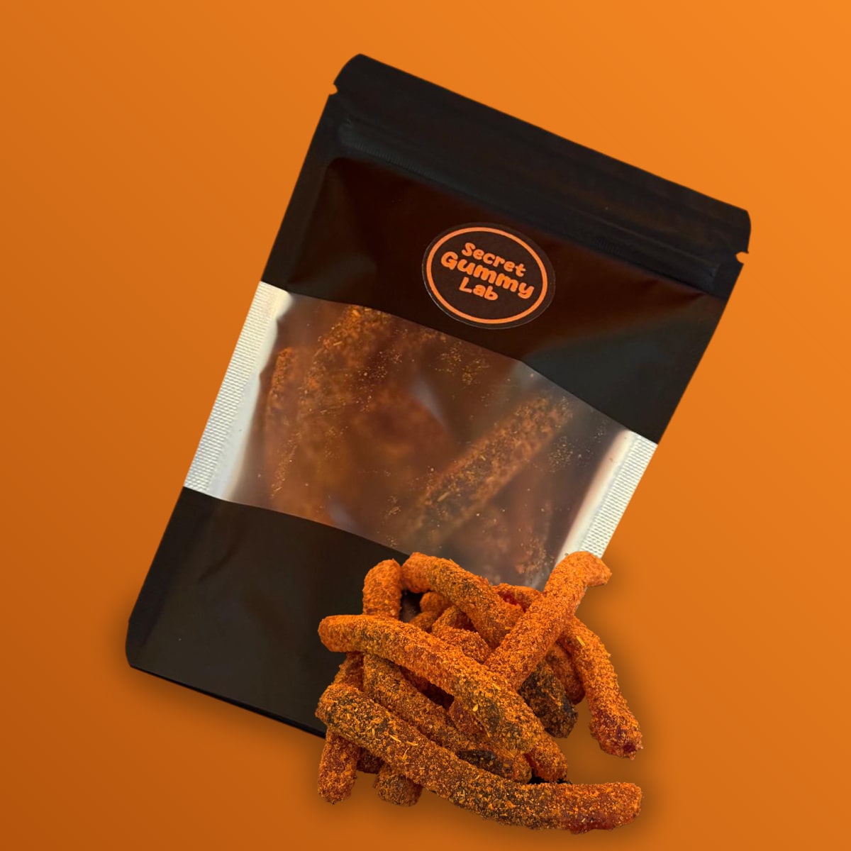Gomitas de lombrices enchiladas con nuestro chamoy secreto y mix de chilitos.